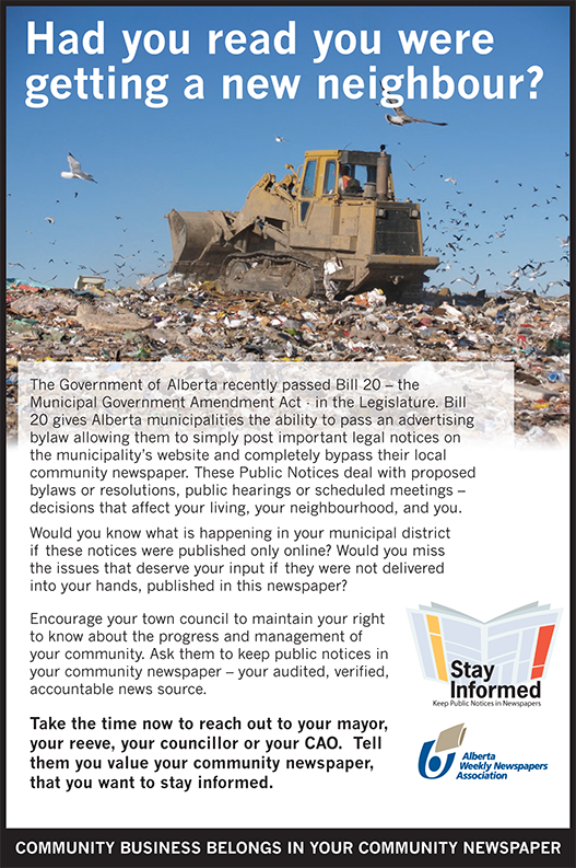 And just as ridiculous is the explanation given by Municipal Affairs Minister Diana McQueen to rationalize this idiotic legislation: "Albertans have observed that traditional notification methods may no longer be effective in communicating with the public due to increasing costs and limited accessibility in smaller communities..."
