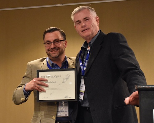 Today, following the retirement of long-time VP Paul Rockley, Brian is Vice President, Publishing at Great West. He’s a thoroughly committed, ink in his veins, newspaper guy. He understands the value of community engagement and building a better community through the newspaper. He truly gets it. And I take great pride in presenting him with the Silver Quill commemorating his 25 years of service to our industry.